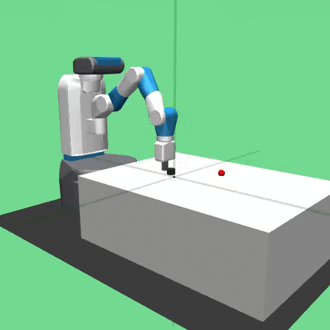 The task in the environment is for a manipulator hit a puck in order to reach a target position on top of a long and slippery table. The table has a low friction coefficient in order to make it slippery for the puck to slide and be able to reach the target position which is outside of the robot’s workspace. The robot is a 7-DoF Fetch Mobile Manipulator with a two-fingered parallel gripper. The robot is controlled by small displacements of the gripper in Cartesian coordinates and the inverse kinematics are computed internally by the MuJoCo framework. The gripper is locked in a closed configuration since the puck doesn’t need to be graspped. The task is also continuing which means that the robot has to maintain the puck in the target position for an indefinite period of time.