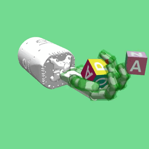 The environment is based on the same robot hand as in the HandReach environment, the Shadow Dexterous Hand. The task to be solved is the same as in the HandManipulateBlock environment. However, in this case the environment observation also includes tactile sensory information. This is achieved by placing a total of 92 MuJoCo touch sensors in the palm and finger phalanxes of the hand. The sensors are created by specifying the tactile sensors’ active zones by so-called sites. Each site can be represented as either ellipsoid (for the finger tips) or box (for the phalanxes and palm sensors). When rendering the environment the sites are visualized as red and green transparent shapes attached to the hand model. If a body’s contact point falls within a site’s volume and involves a geometry attached to the same body as the site, the corresponding contact force is included in the sensor reading. Soft contacts do not influence the above computation except inasmuch as the contact point might move outside of the site, in which case if a contact point falls outside the sensor zone, but the normal ray intersects the sensor zone, it is also included. MuJoCo touch sensors only report normal forces using Minkowski Portal Refinement approach . The output of the contact sensor is a non-negative scalar value of type float that is computed as the sum of all contact normal forces that were included for this sensor in the current time step . Thus, each sensor of the 92 virtual touch sensors has a non-negative scalar value.