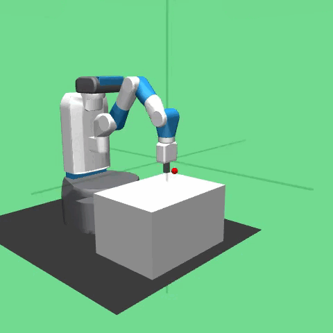 The task in the environment is for a manipulator to move the end effector to a randomly selected position in the robot’s workspace. The robot is a 7-DoF Fetch Mobile Manipulator with a two-fingered parallel gripper. The robot is controlled by small displacements of the gripper in Cartesian coordinates and the inverse kinematics are computed internally by the MuJoCo framework. The task is also continuing which means that the robot has to maintain the end effector’s position for an indefinite period of time.