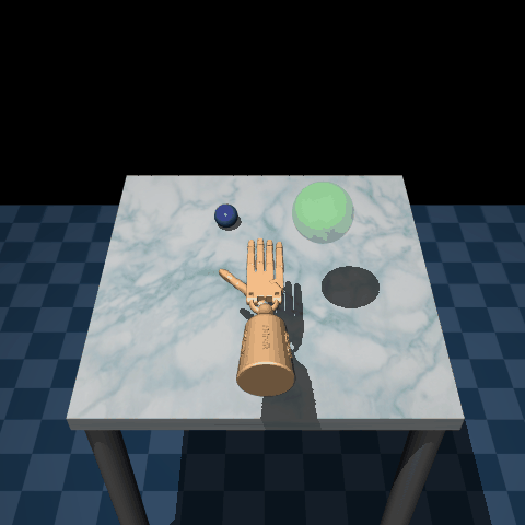 get_to_ball: increasing negative reward the further away the palm of the hand is from the ball. This is computed as the 3 dimensional Euclidean distance between both body frames. This penalty is scaled by a factor of0.1in the final reward.ball_off_table: add a positive reward of 1 if the ball is lifted from the table (zgreater than0.04meters). If this condition is met two additional rewards are added:make_hand_go_to_target: negative reward equal to the 3 dimensional Euclidean distance from the palm to the target ball position. This reward is scaled by a factor of0.5. -make_ball_go_to_target: negative reward equal to the 3 dimensional Euclidean distance from the ball to its target position. This reward is also scaled by a factor of0.5.