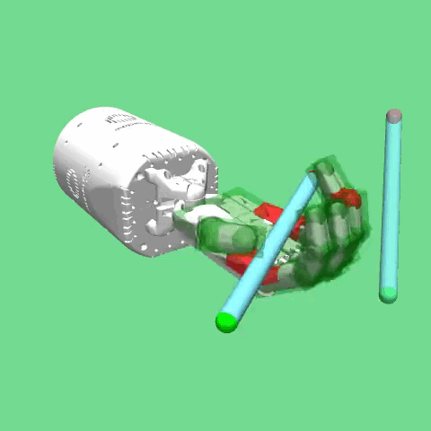 as either ellipsoid (for the finger tips) or box (for the phalanxes and palm sensors). When rendering the environment the sites are visualized as red and green transparent shapes attached to the hand model. If a body’s contact point falls within a site’s volume and involves a geometry attached to the same body as the site,